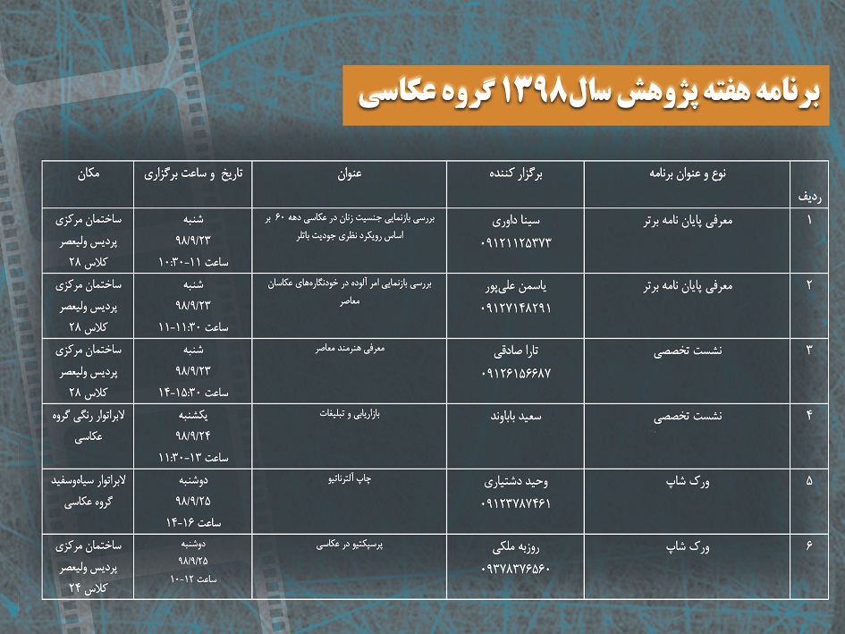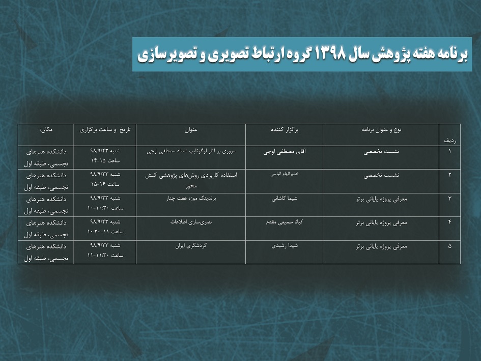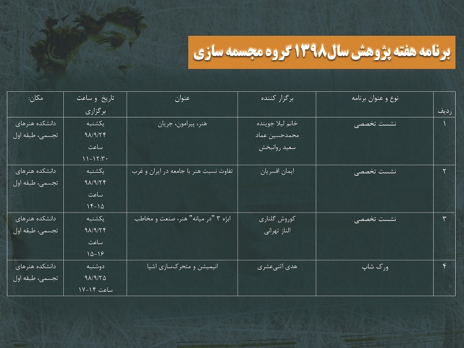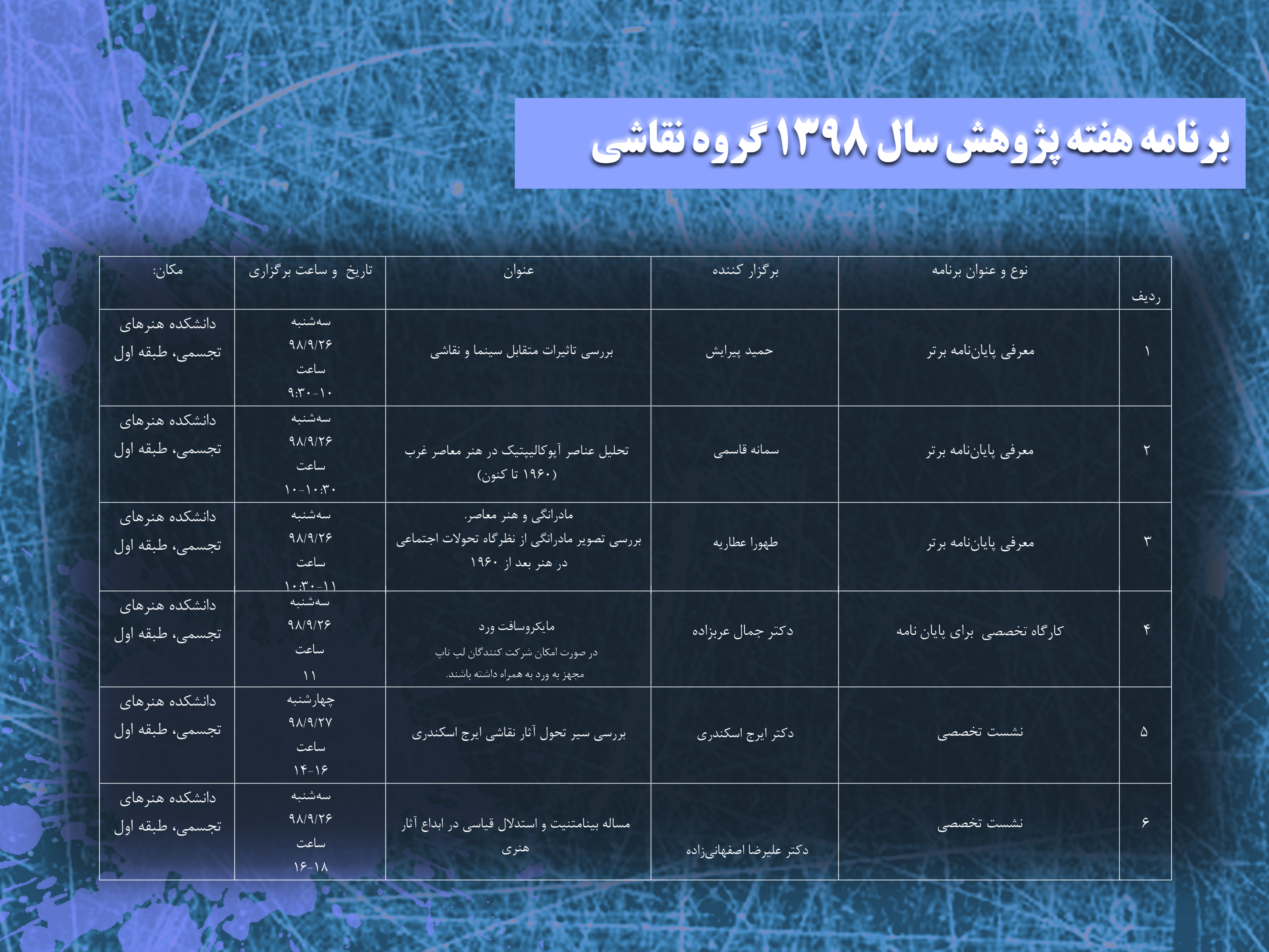 برنامه های هفته پژوهش سال ۹۸ در دانشکده هنرهای تجسمی ۱۶ آذر ۱۳۹۸ | ۱۳:۴۰ کد : ۳۱۱۰ اخبار ارسال به دیگران نام شما ایمیل شما ایمیل دریافتکننده ارسال انصراف تعداد بازدید:۷۹۷