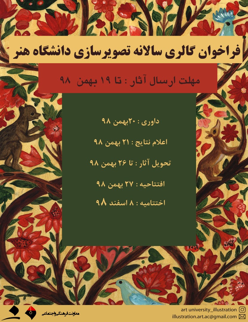 انجمن تصویرسازی دانشگاه هنر در نظر دارد نمایشگاهی از آثار تصویرسازی دانش آموختگان و هنرجویان این دانشگاه برگزار کند لذا از علاقمندان دعوت میشود برای شرکت در نمایشگاه، حداکثر سه نمونه از آثار خود را به همراه اطلاعات تماس برای ایمیل انجمن به ادرس illustration.art.ac@gmail.com ارسال نمایند.