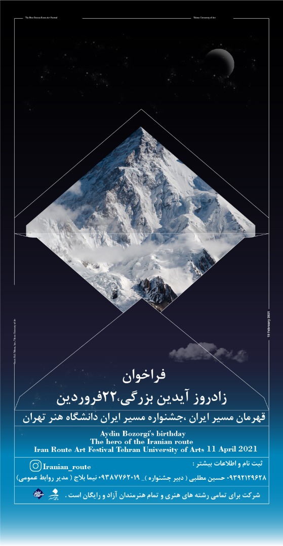 هنرمندان عزیز، بمناسبت زادروز آیدین بزرگی ( یکی از سه قهرمان مسیر ایران، فاتحان و گشایشگران مسیر ایرانیان بر کوه برودپیک هیمالیا) و به افتخارش پذیرای آثار هنریتان هستیم.