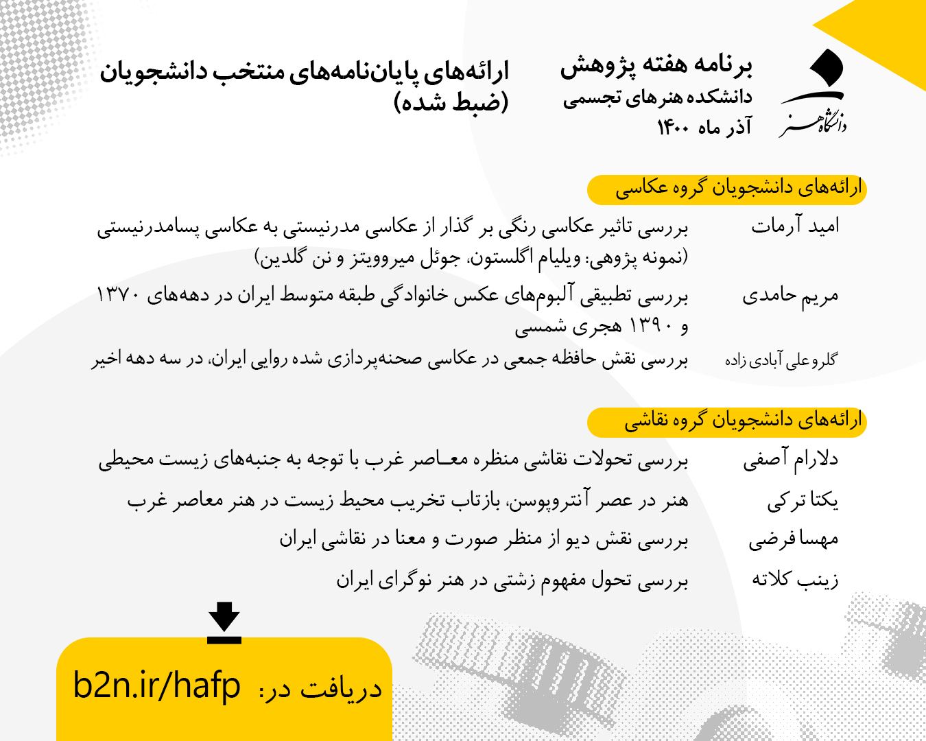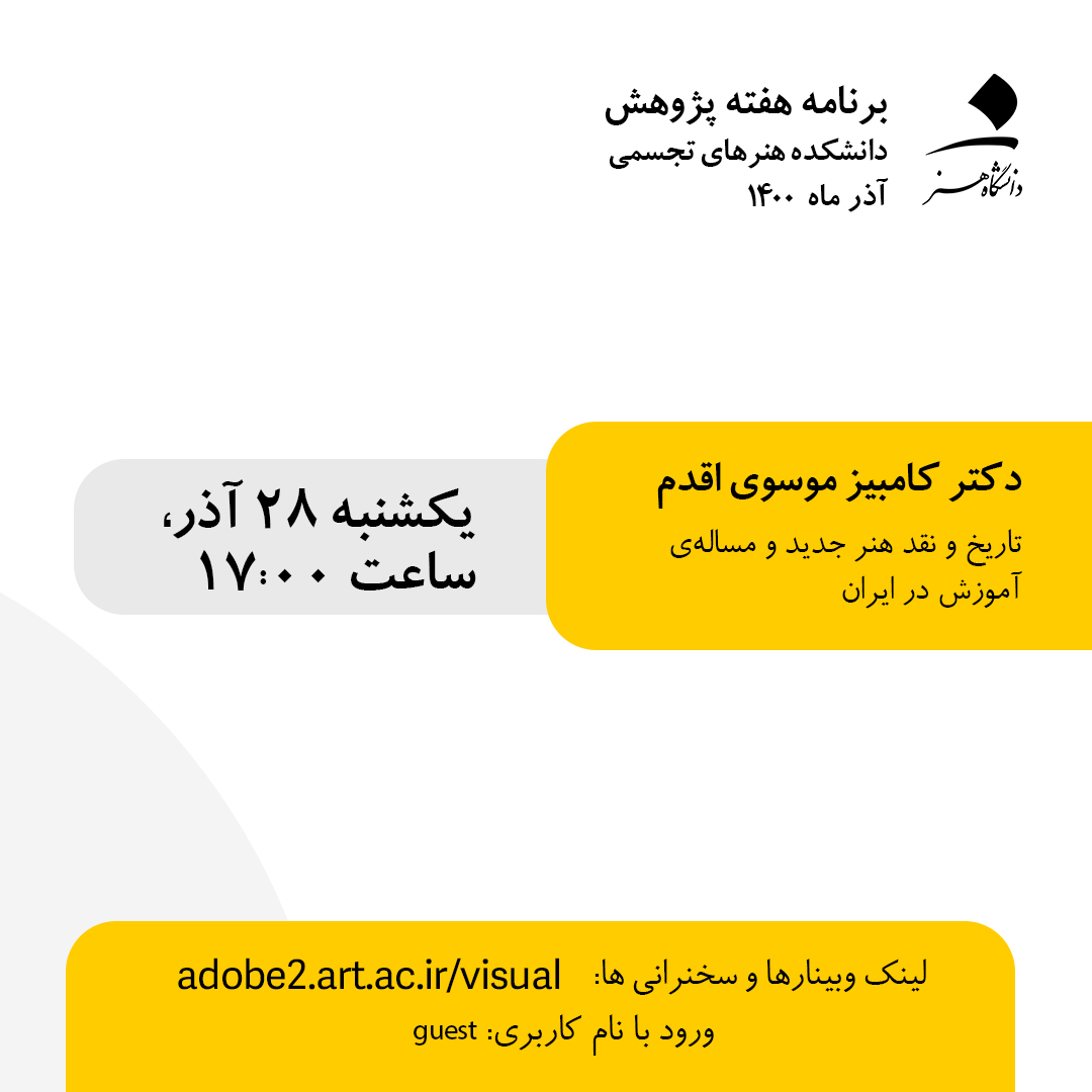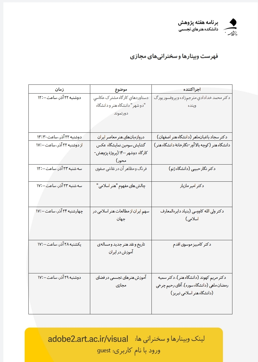 برنامه های هفته پژوهش دانشکده هنرهای تجسمی ۲۳ آذر ۱۴۰۰ | ۲۲:۱۹ کد : ۴۶۱۵ اخبار ارسال به دیگران نام شما ایمیل شما ایمیل دریافتکننده ارسال انصراف تعداد بازدید:۲۵۷