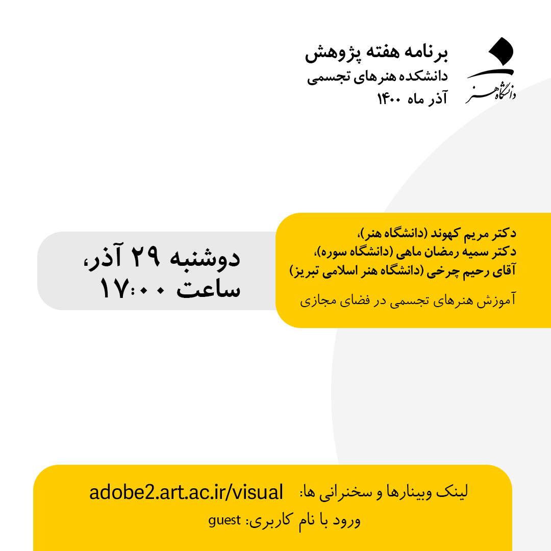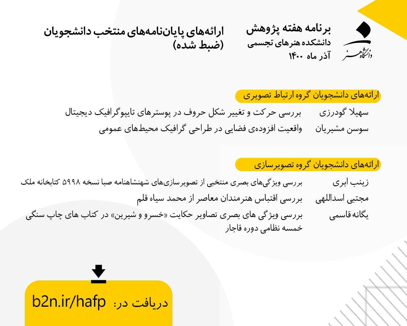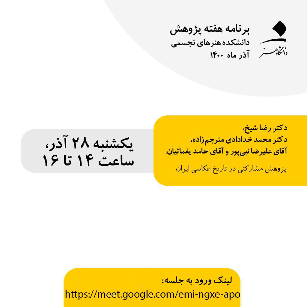 برنامه های هفته پژوهش دانشکده هنرهای تجسمی ۲۳ آذر ۱۴۰۰ | ۲۲:۱۹ کد : ۴۶۱۵ اخبار ارسال به دیگران نام شما ایمیل شما ایمیل دریافتکننده ارسال انصراف تعداد بازدید:۲۵۷