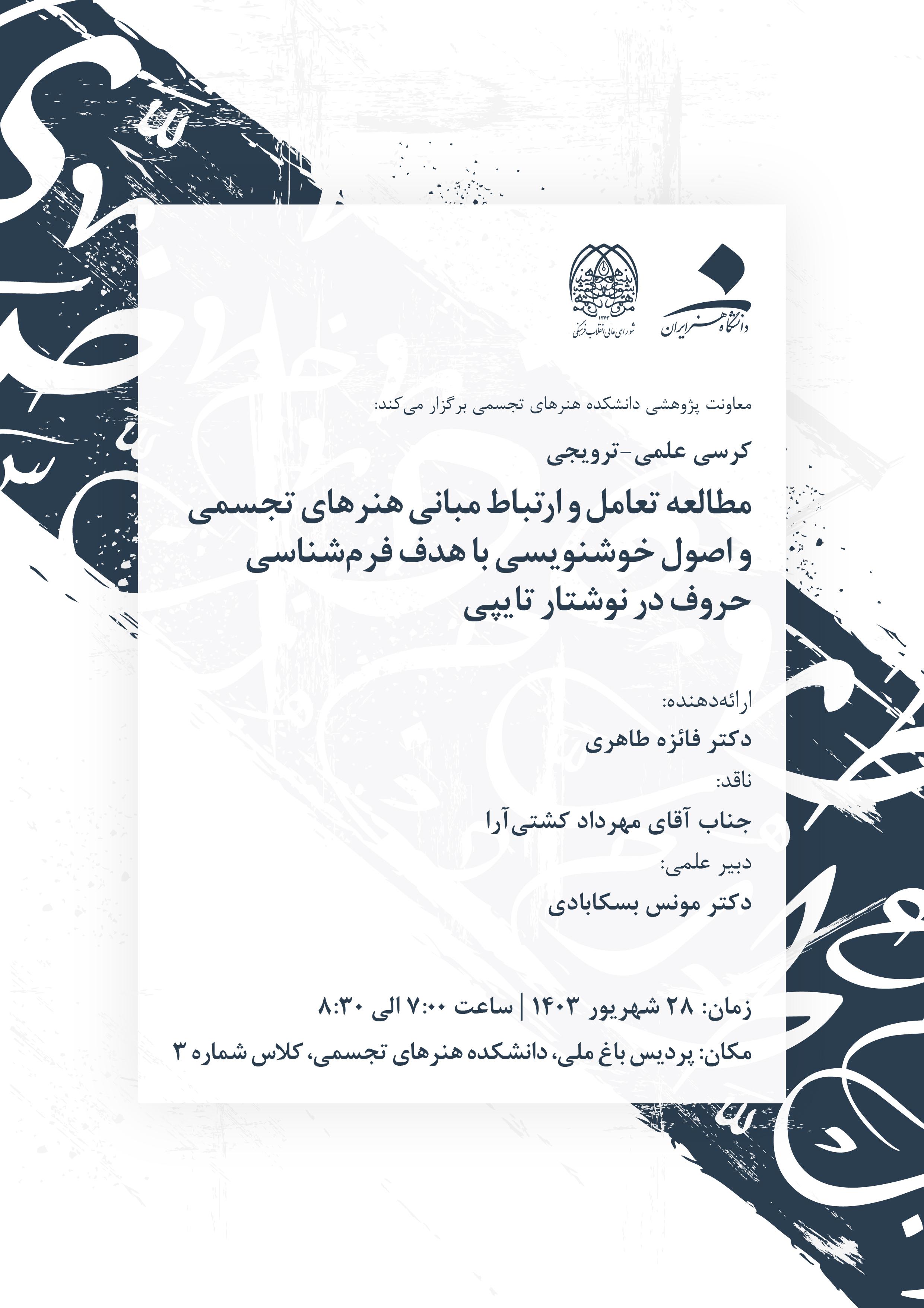 دانشکده هنرهای تجسمی برگزار می کند: کرسی علمی ترویجی با موضوع:مطالعه تعامل و ارتباط مبانی هنرهای تجسمی و اصول خوشنویسی با هدف فرم شناسی حروف در نوشتار تایپی ۲۷ شهریور ۱۴۰۳ | ۱۴:۰۵ کد : ۶۳۹۶ اخبار ارسال به دیگران نام شما ایمیل شما ایمیل دریافتکننده ارسال انصراف تعداد بازدید:۳۳۱